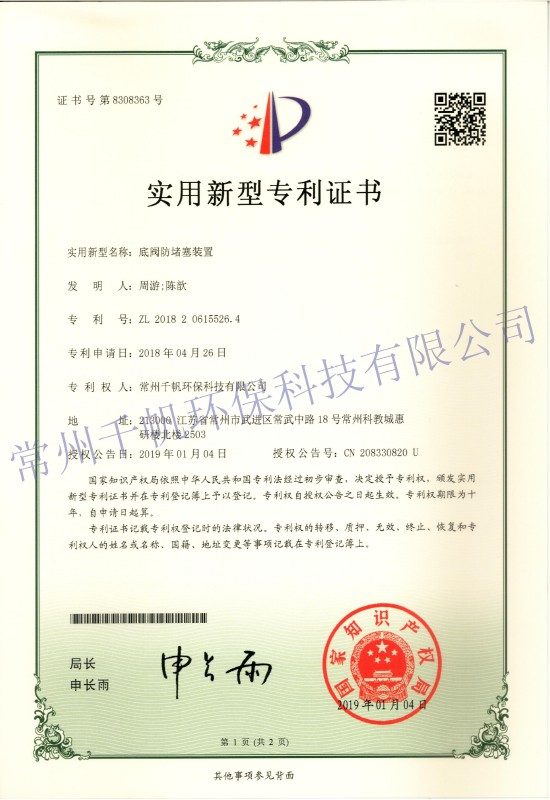 實用新型專利證書 一種平面池底污泥清理系統(tǒng)